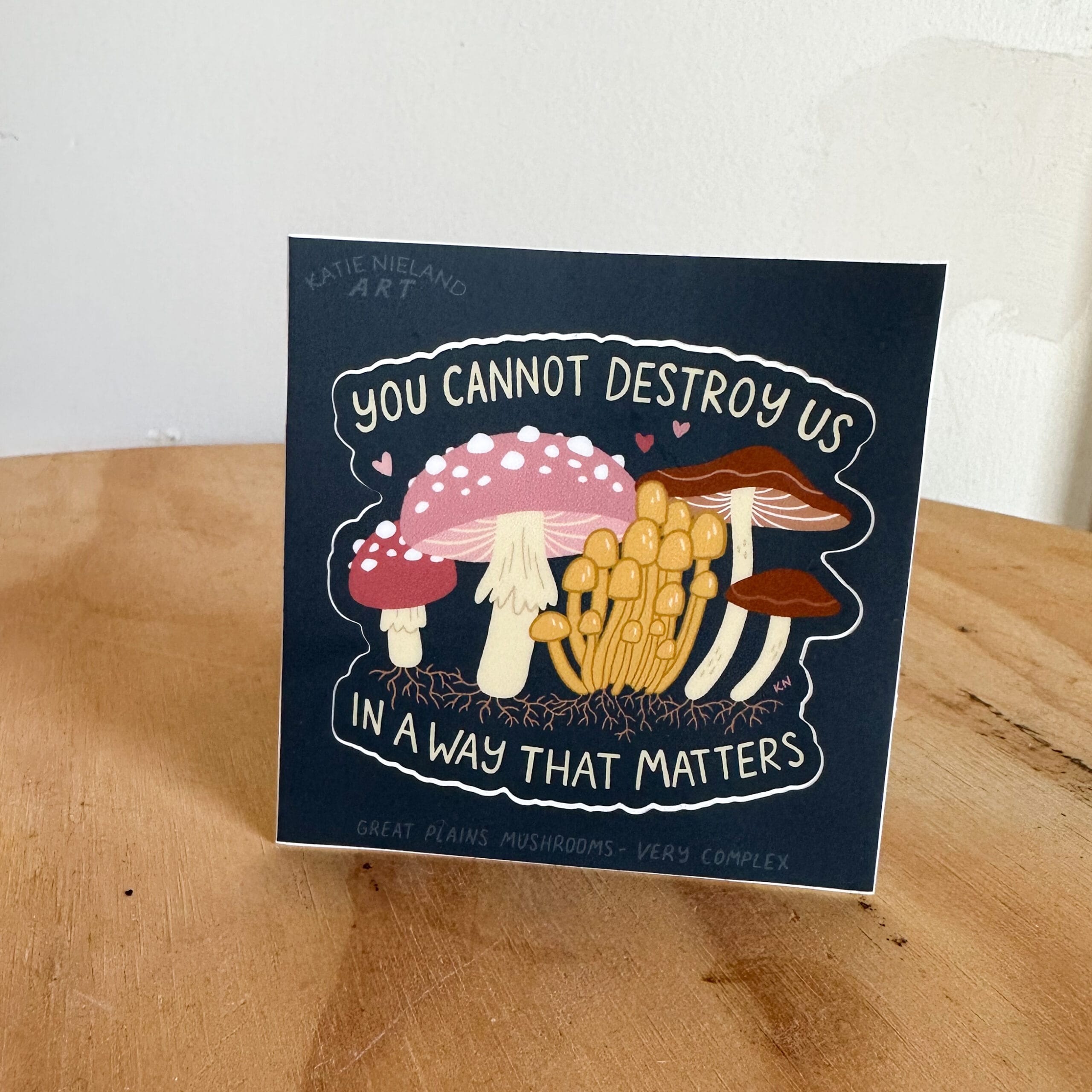 This hand drawn sticker from Lincoln, Nebraska features a variety of mushrooms on a light navy background with the phrase “You cannot destroy us in a way that matters.” It’s a nod to the resilient, regenerative nature of mushrooms and a quiet reminder of strength and survival.