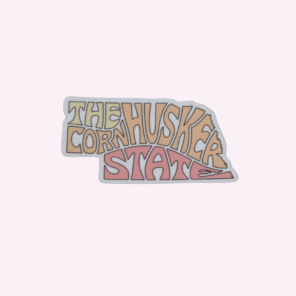 Celebrate Nebraska pride with this retro-inspired “The Cornhusker State” sticker. Featuring bold, groovy lettering in warm colors shaped like the state of Nebraska, it’s perfect for water bottles, laptops, notebooks, or anywhere you want to show off your Husker State roots.